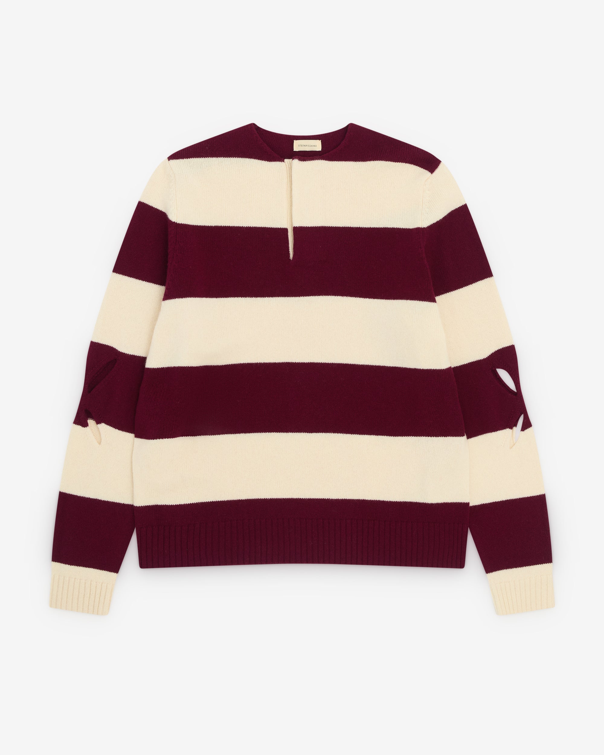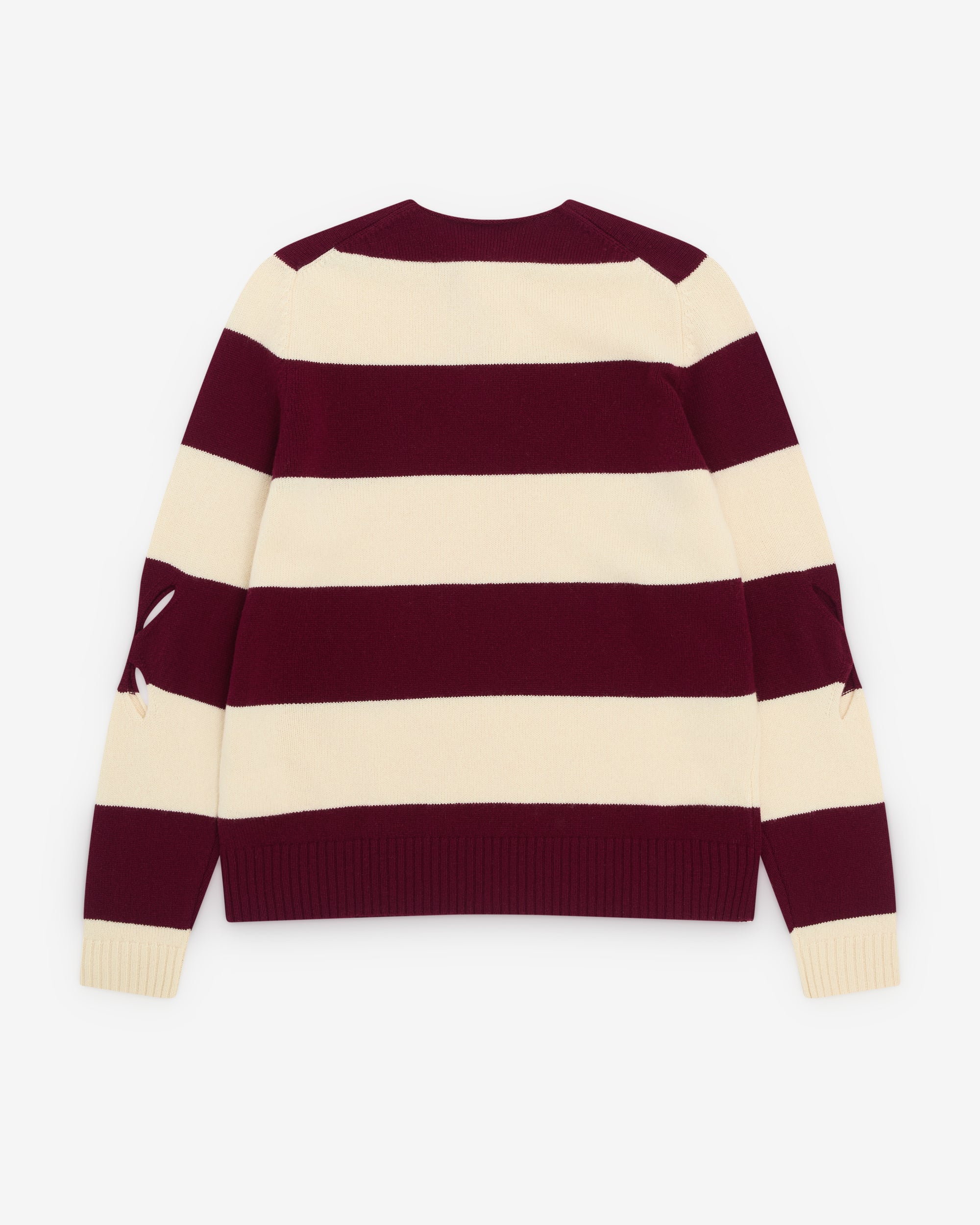 Round neckRib knit trimsCut out at elbowConcealed button fastening at necklineIntarsia knit stripes