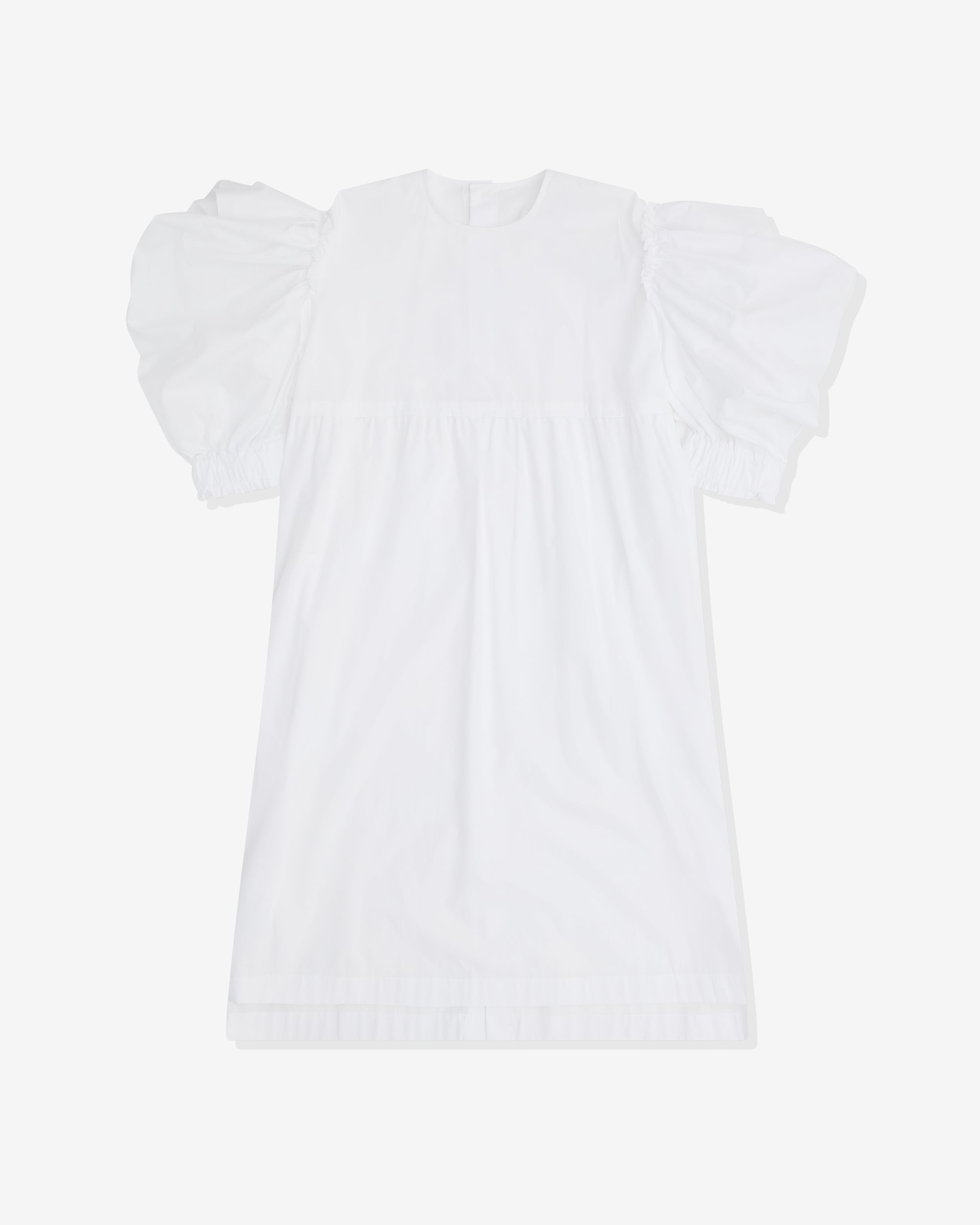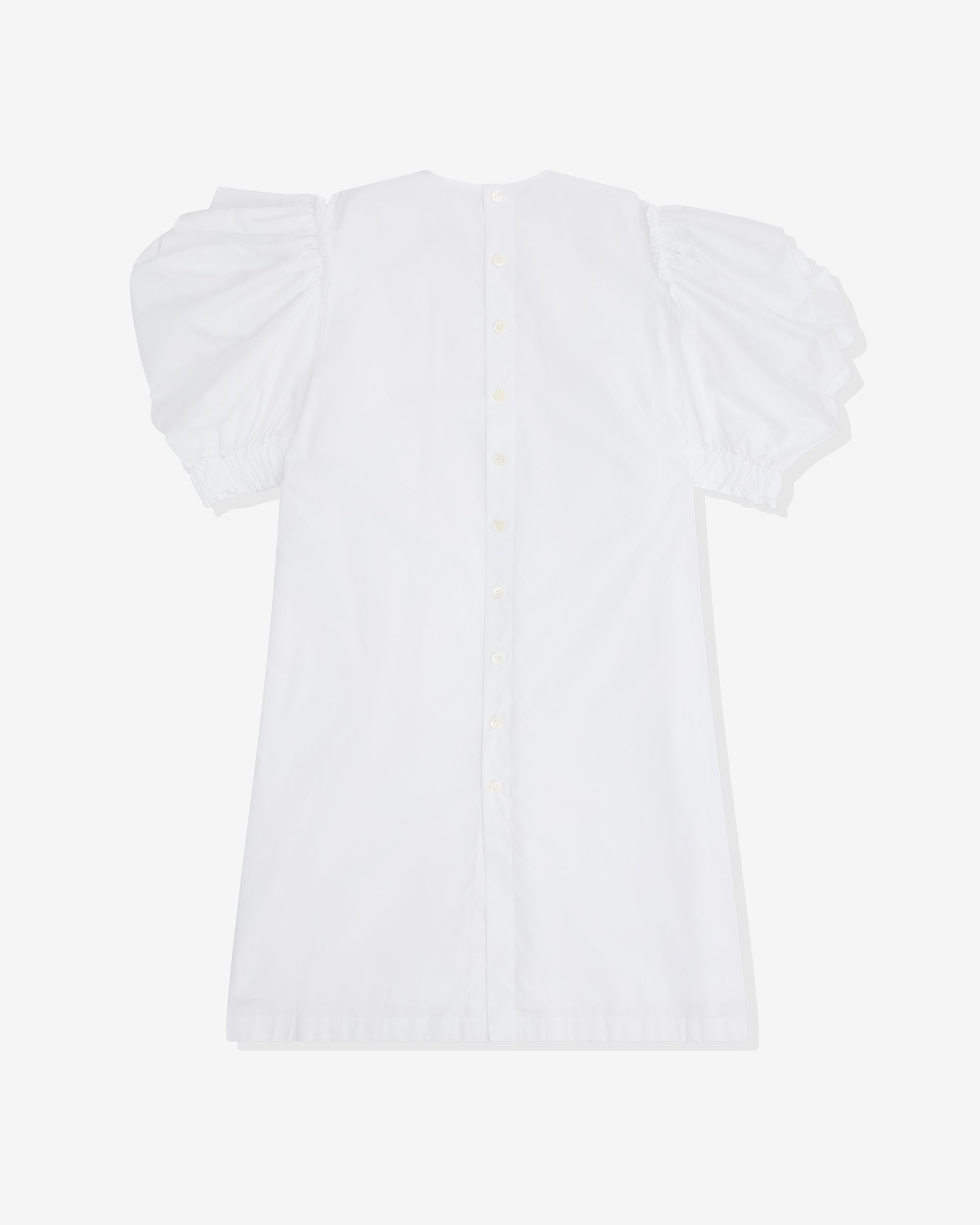 Round neckPuff sleevesElasticated cuffEmpire waistMini-lengthRear button fastening100% CottonMade in Japan