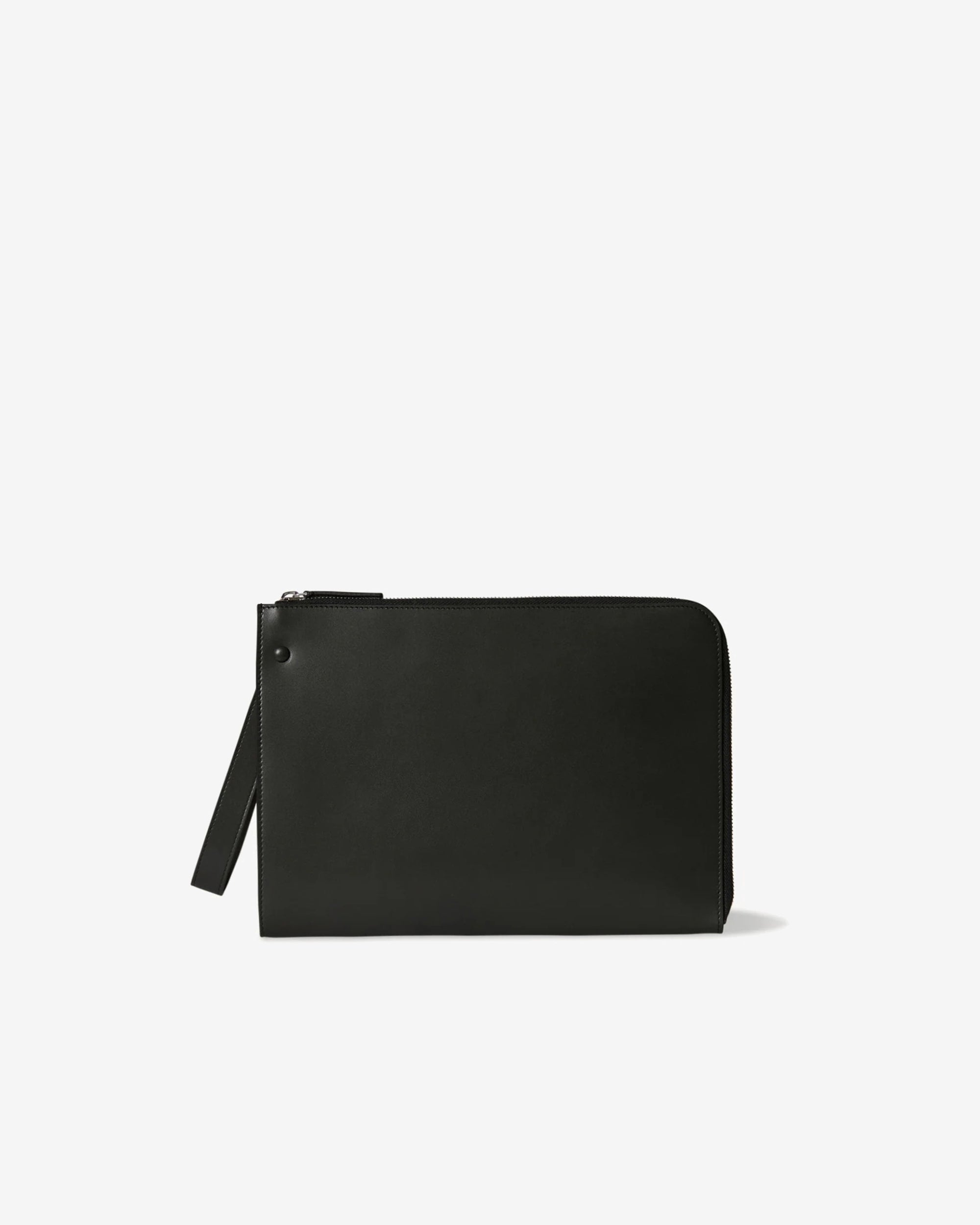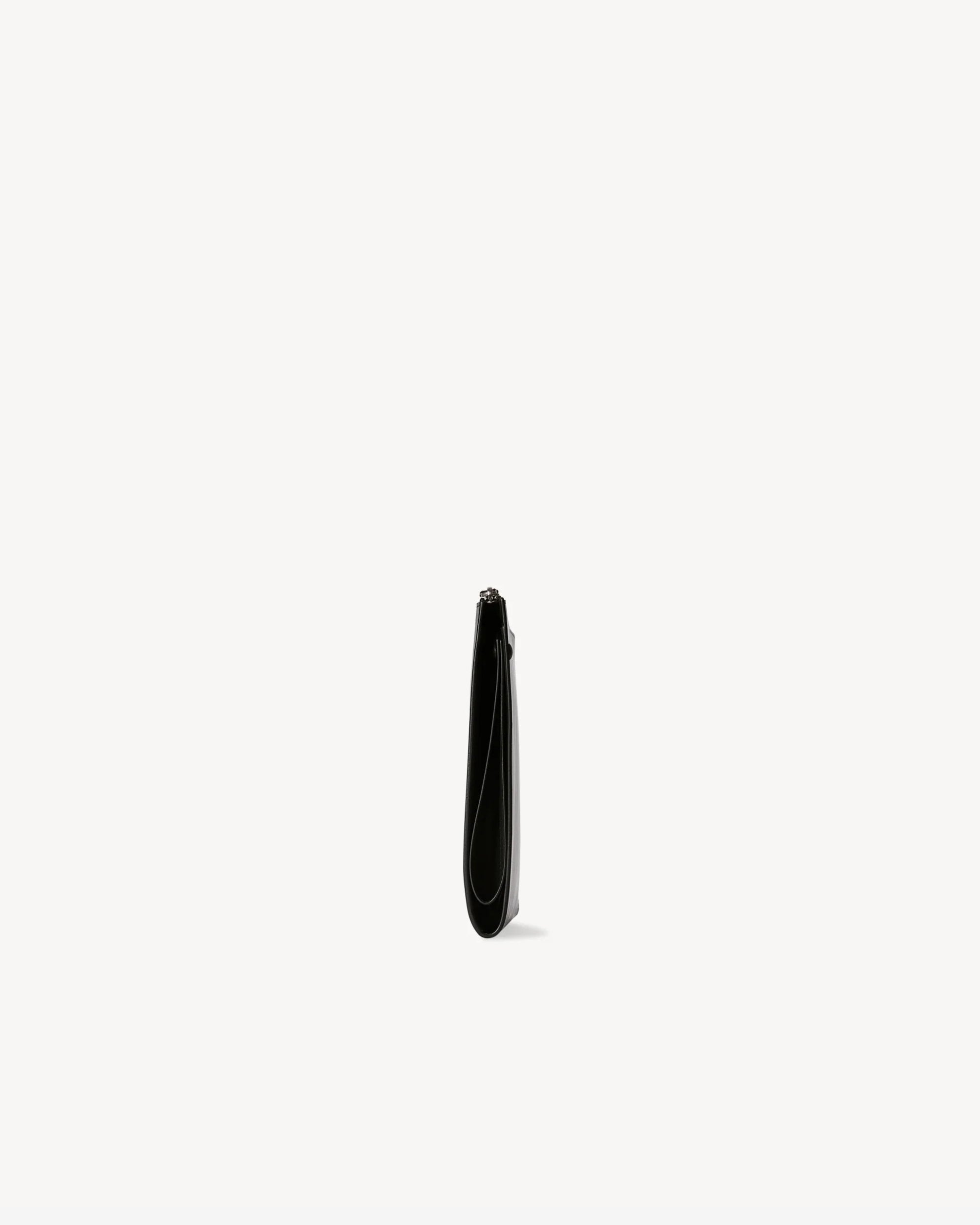 Structured rectangular wristlet in matte box calf leather with interior pocket, thin leather loop, and top zipper closure.