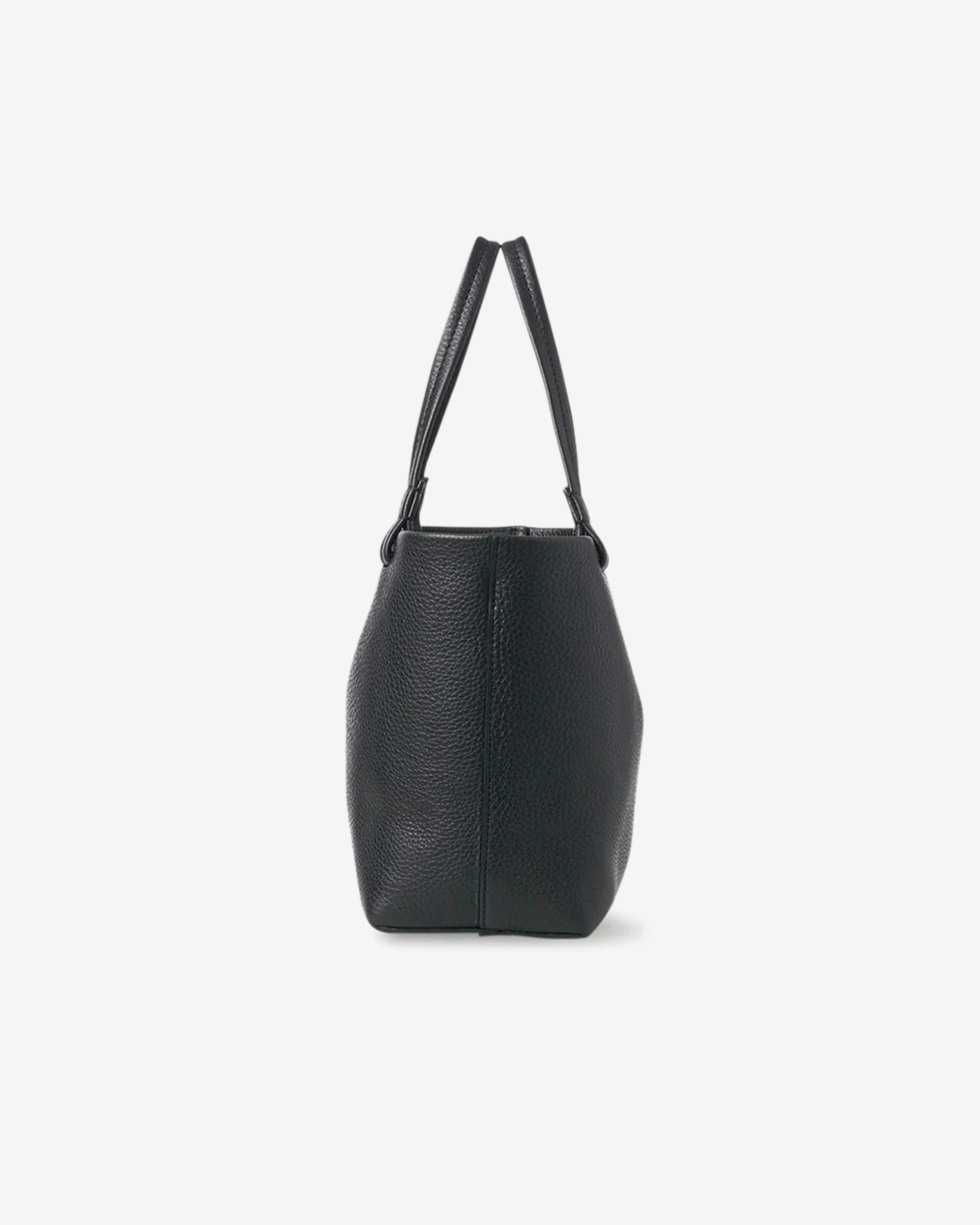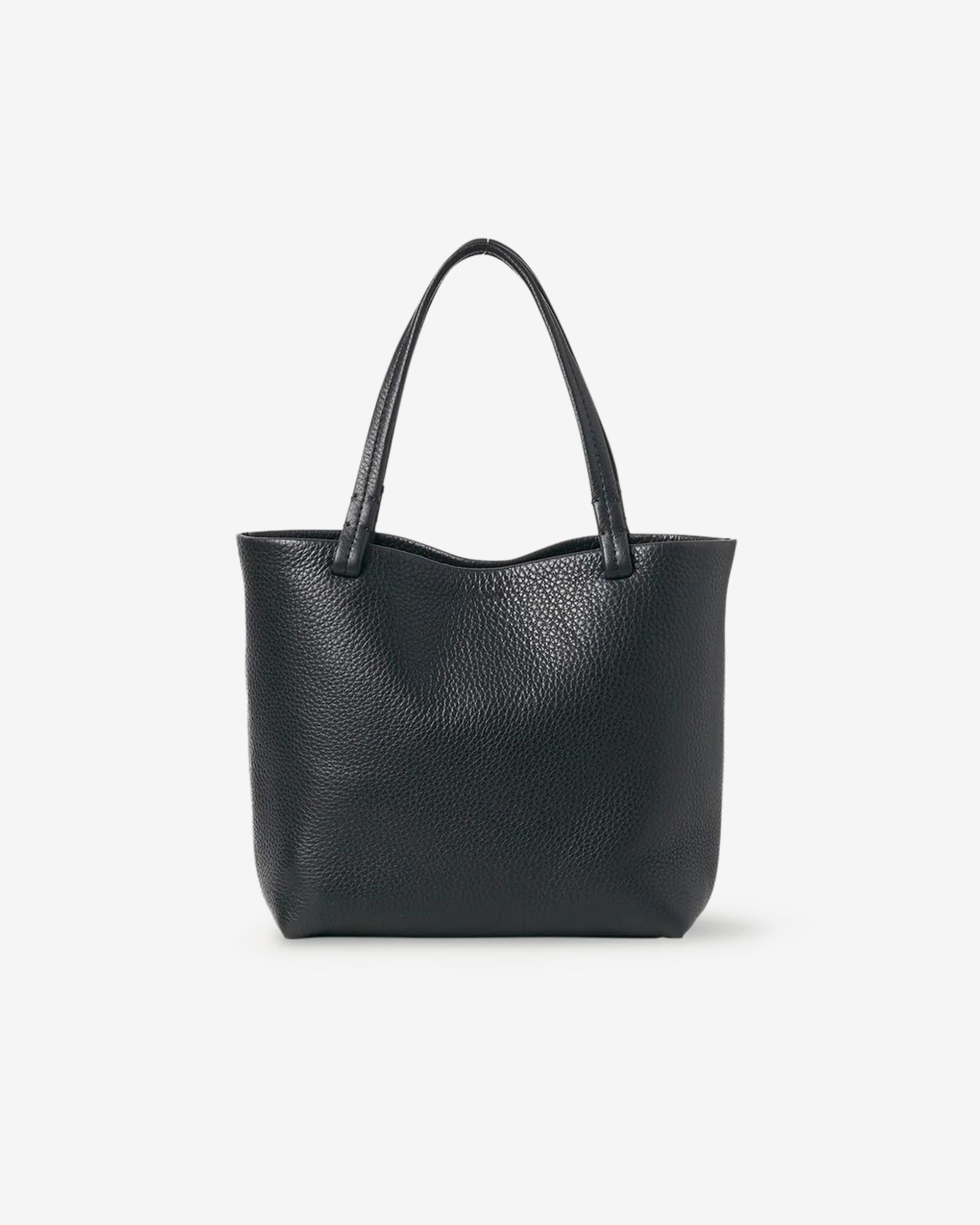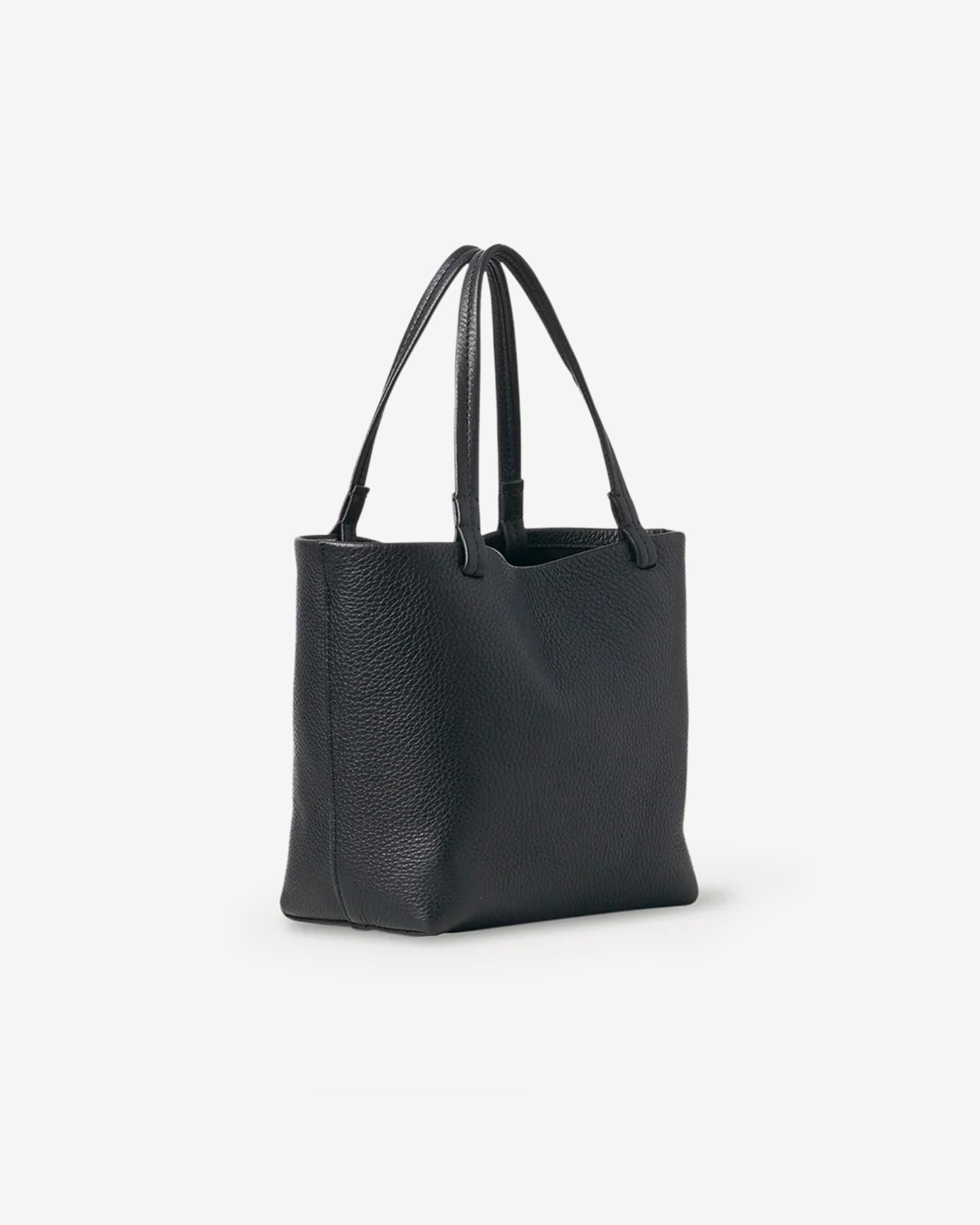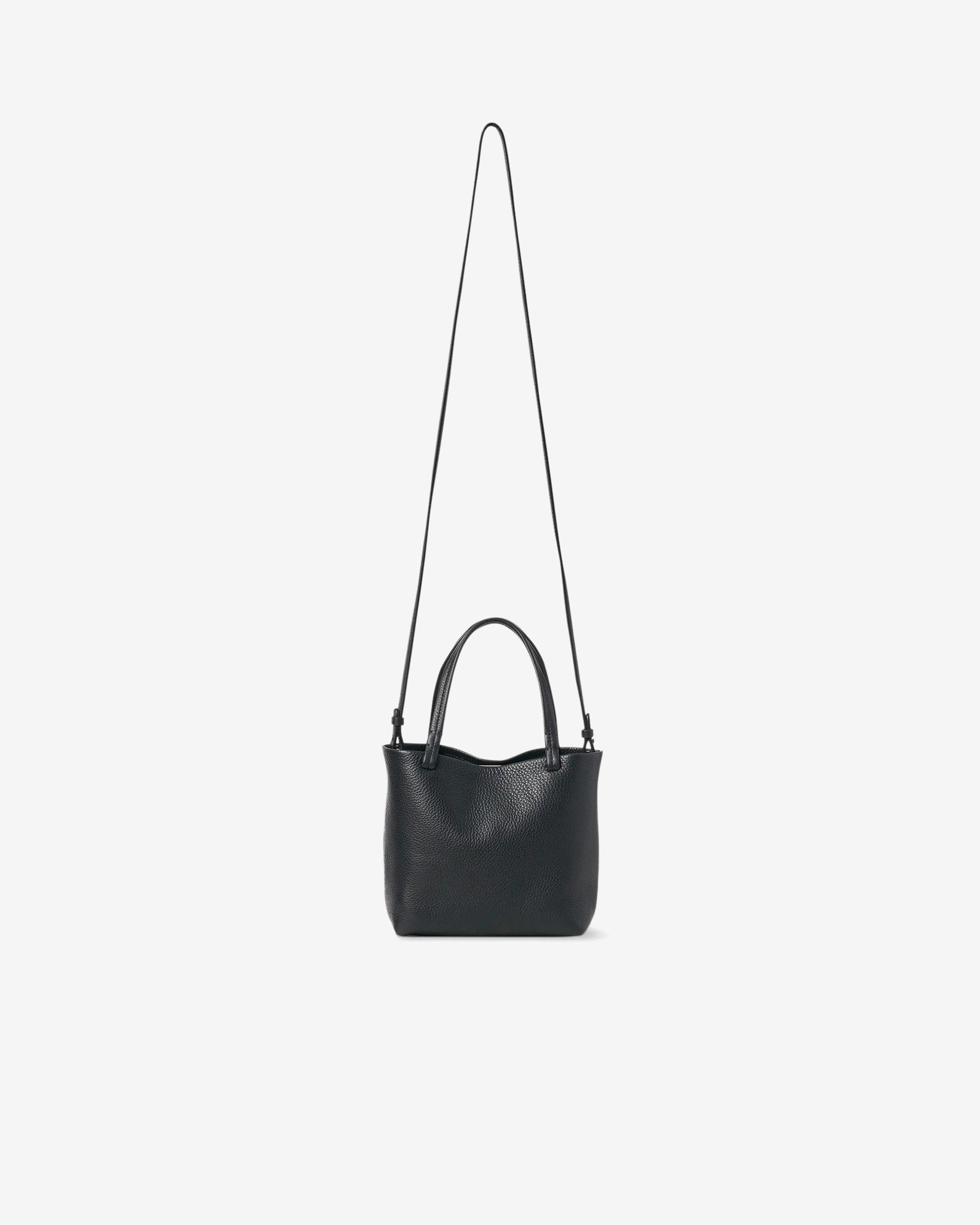 Petite tote bag in grained calfskin leather with detachable shoulder strap, flat top handles, and interior toggle closure.