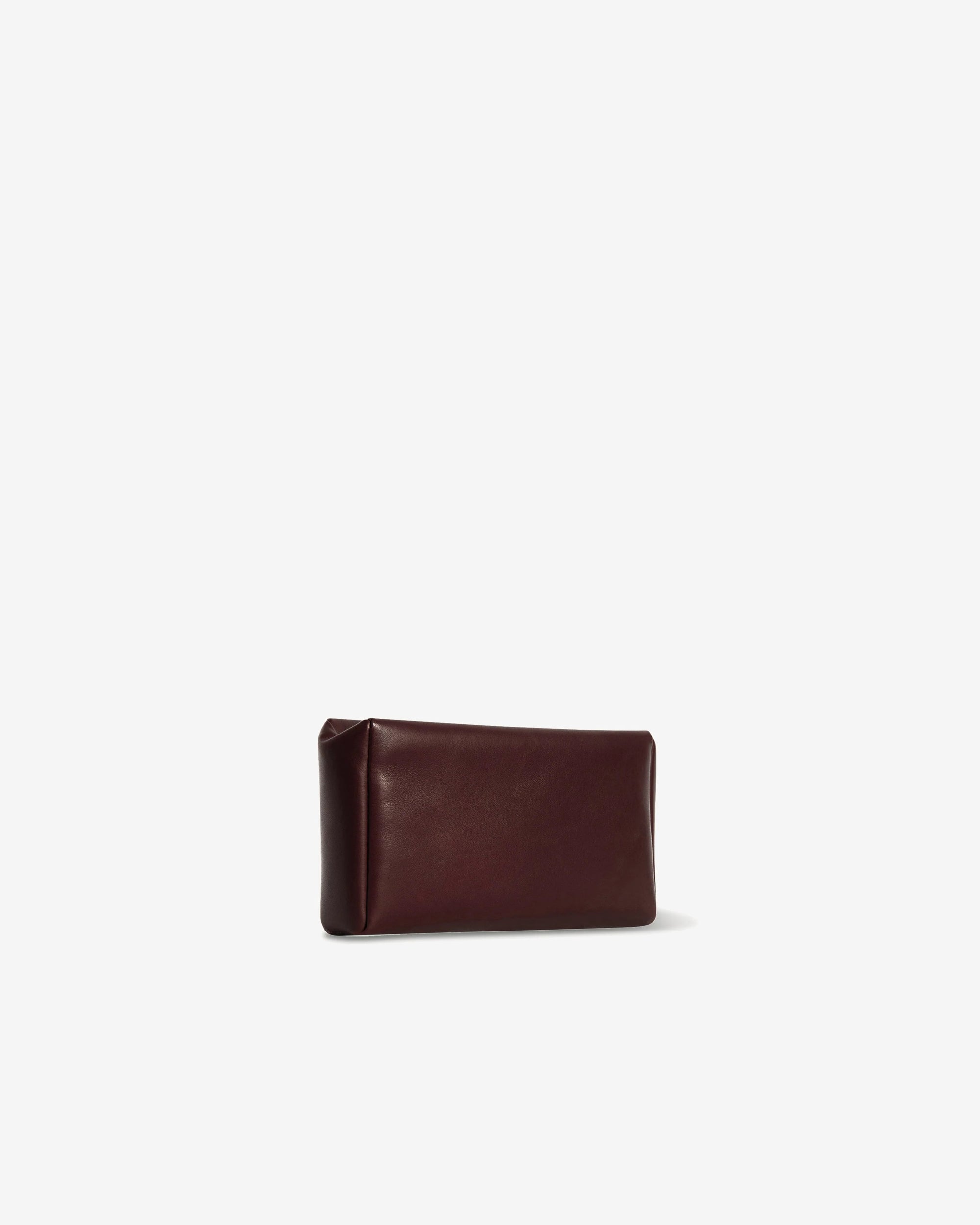Rectangular clutch in smooth nappa leather with gently folded top, gusseted side panels, and zipper closure.