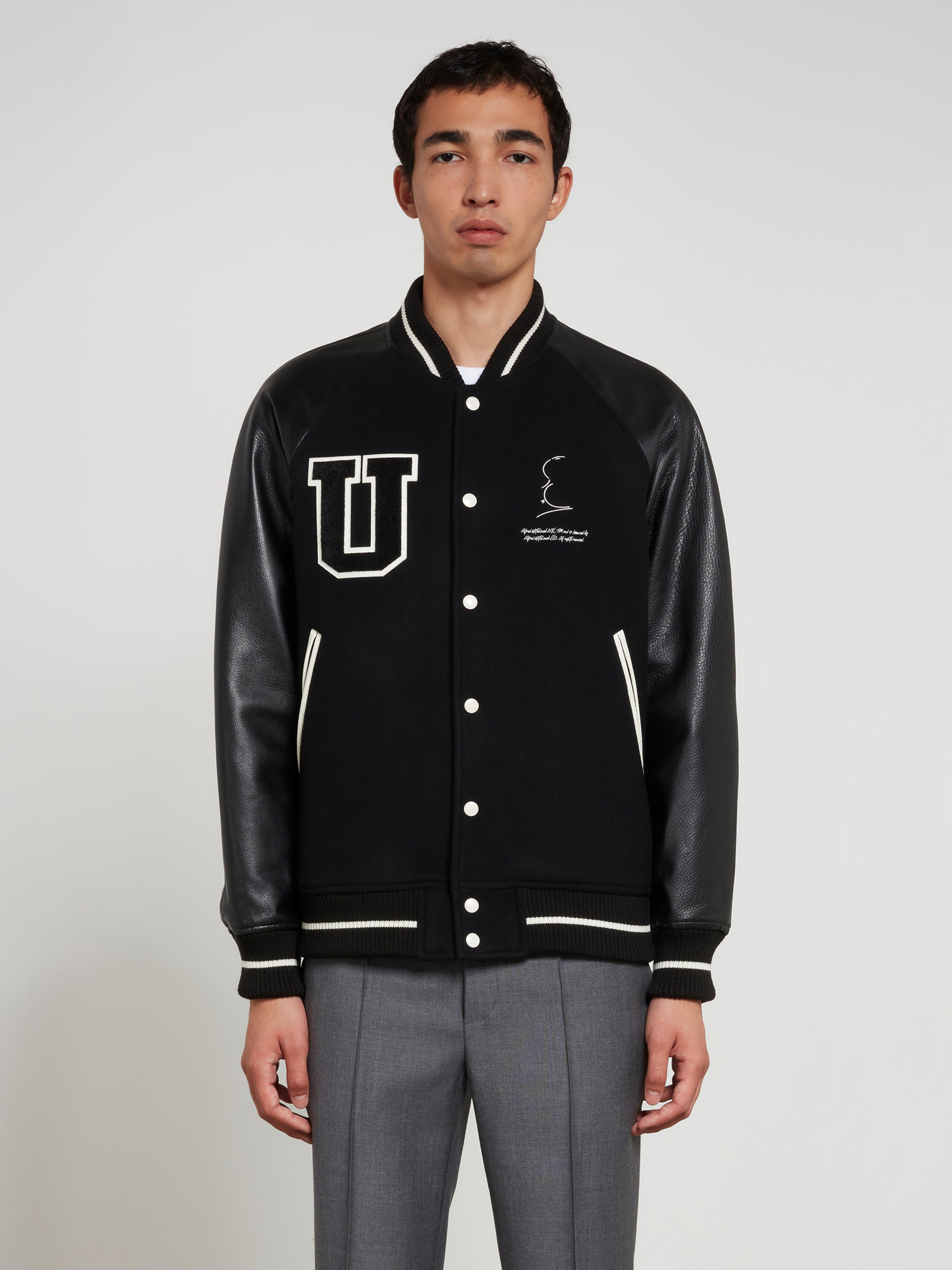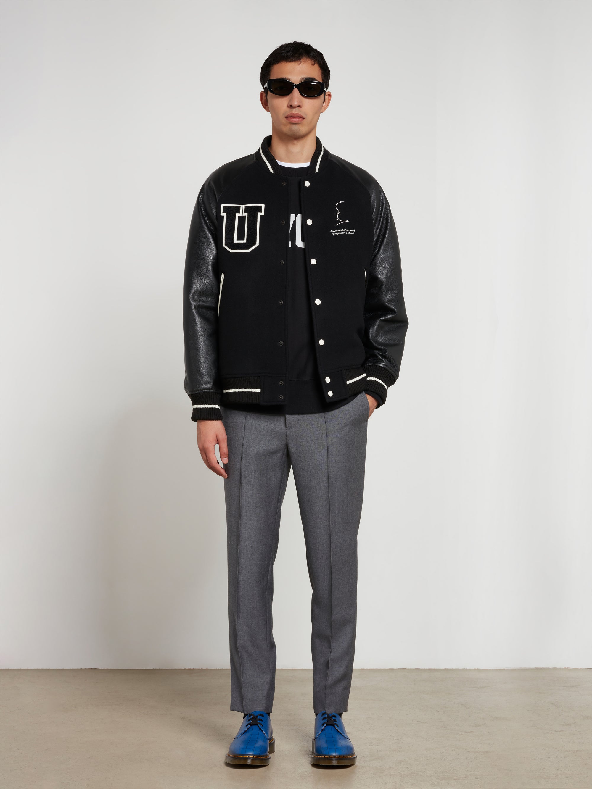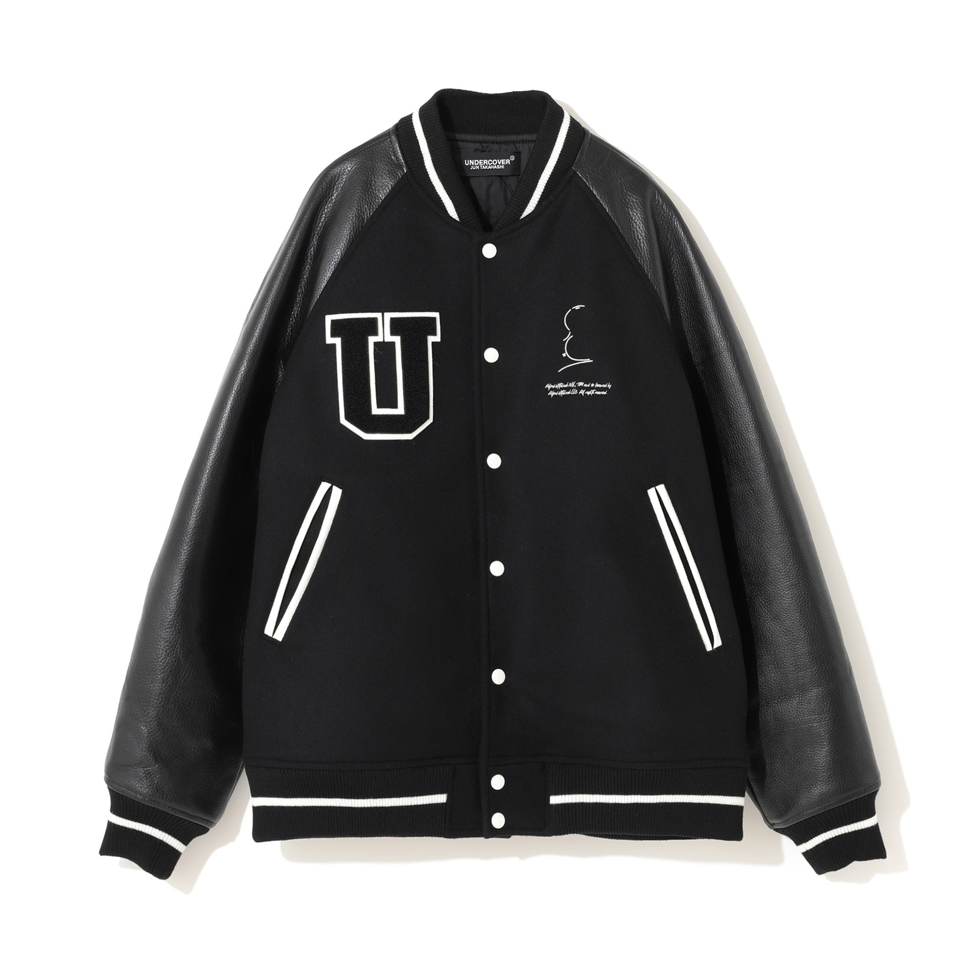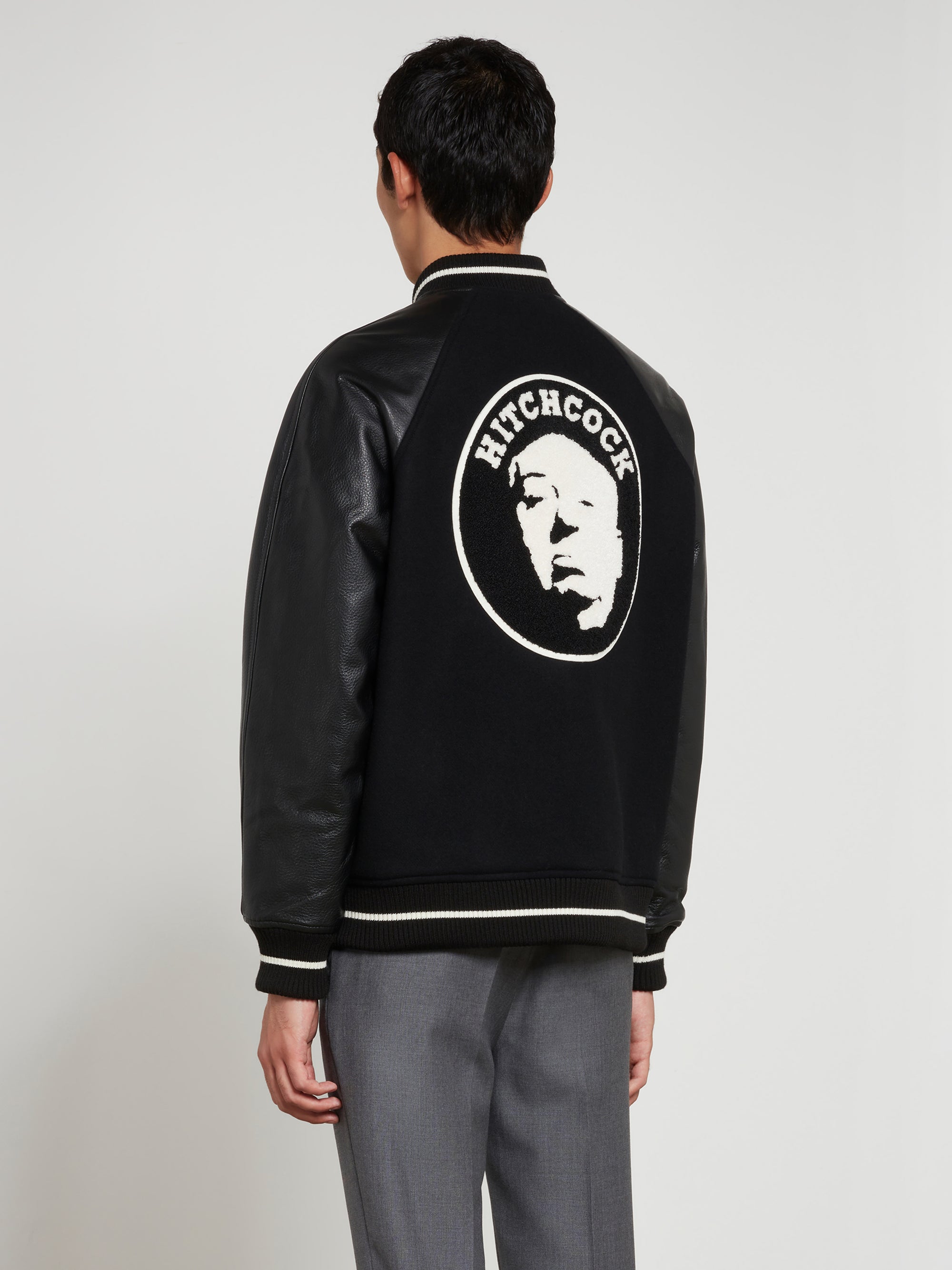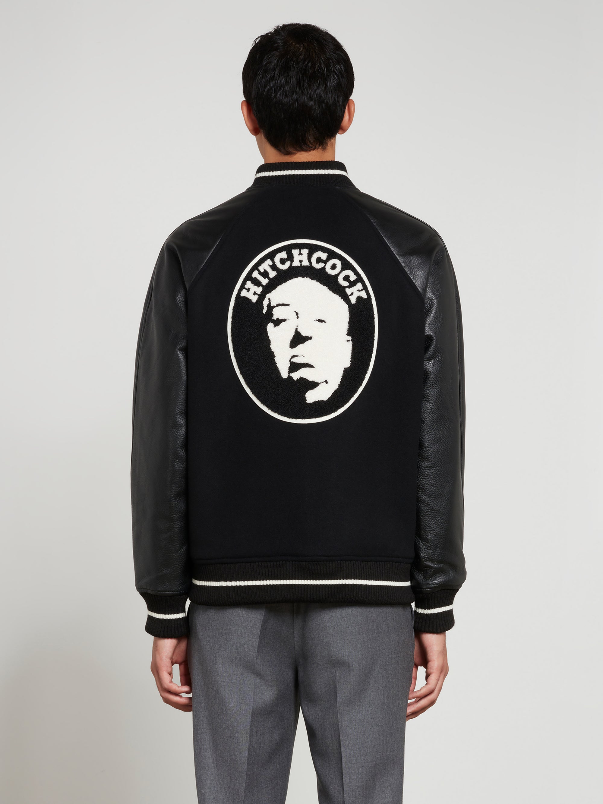 Undercover wool blouson, featuring a stitched front Undercover logo and back embroidered depiction of late English filmmaker, Alfred Hitchcock.