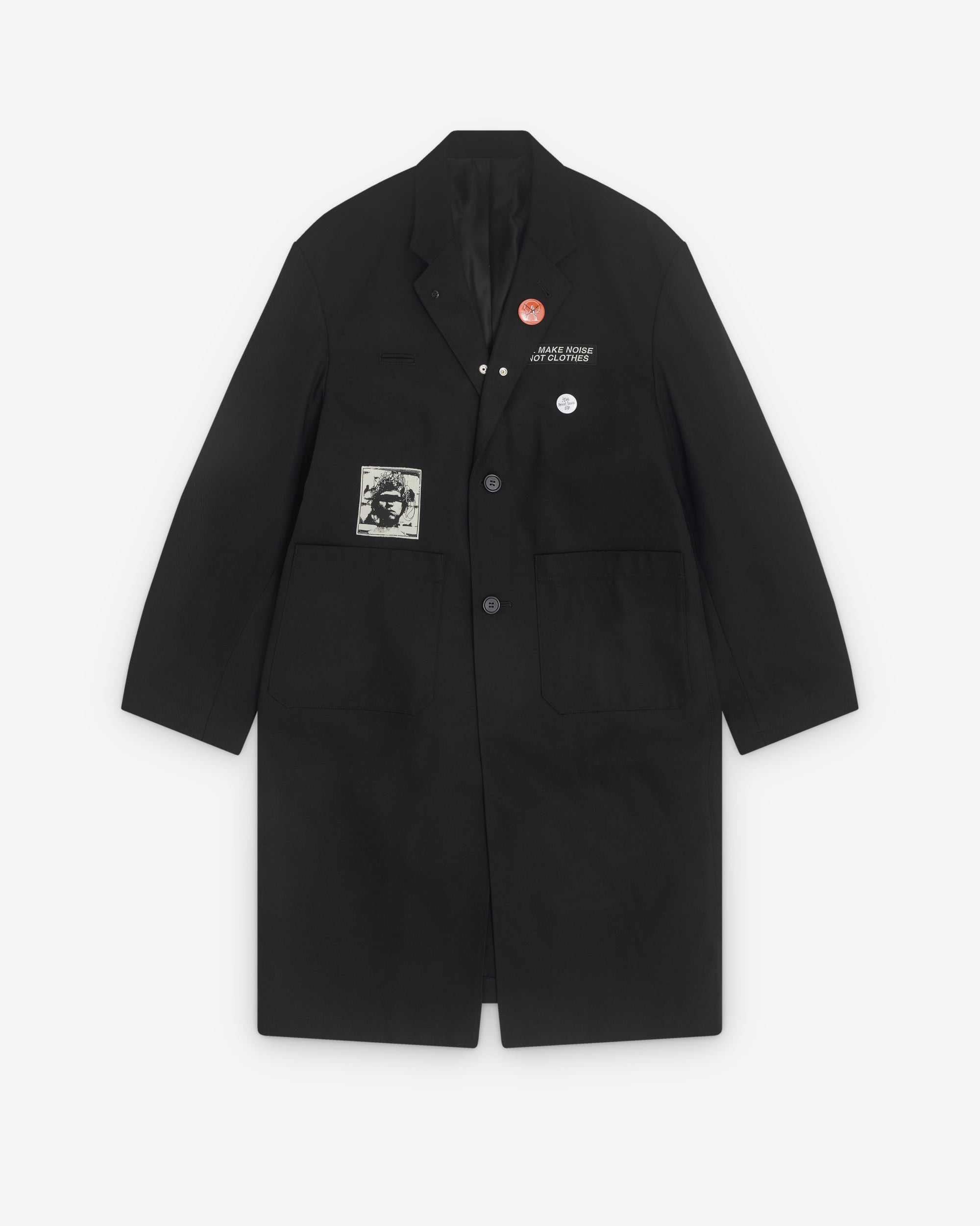 Notched lapel coat collarSingle breastedTwo button closureFront pocketsGraphic patches and pinsInternal lining Split rear hem