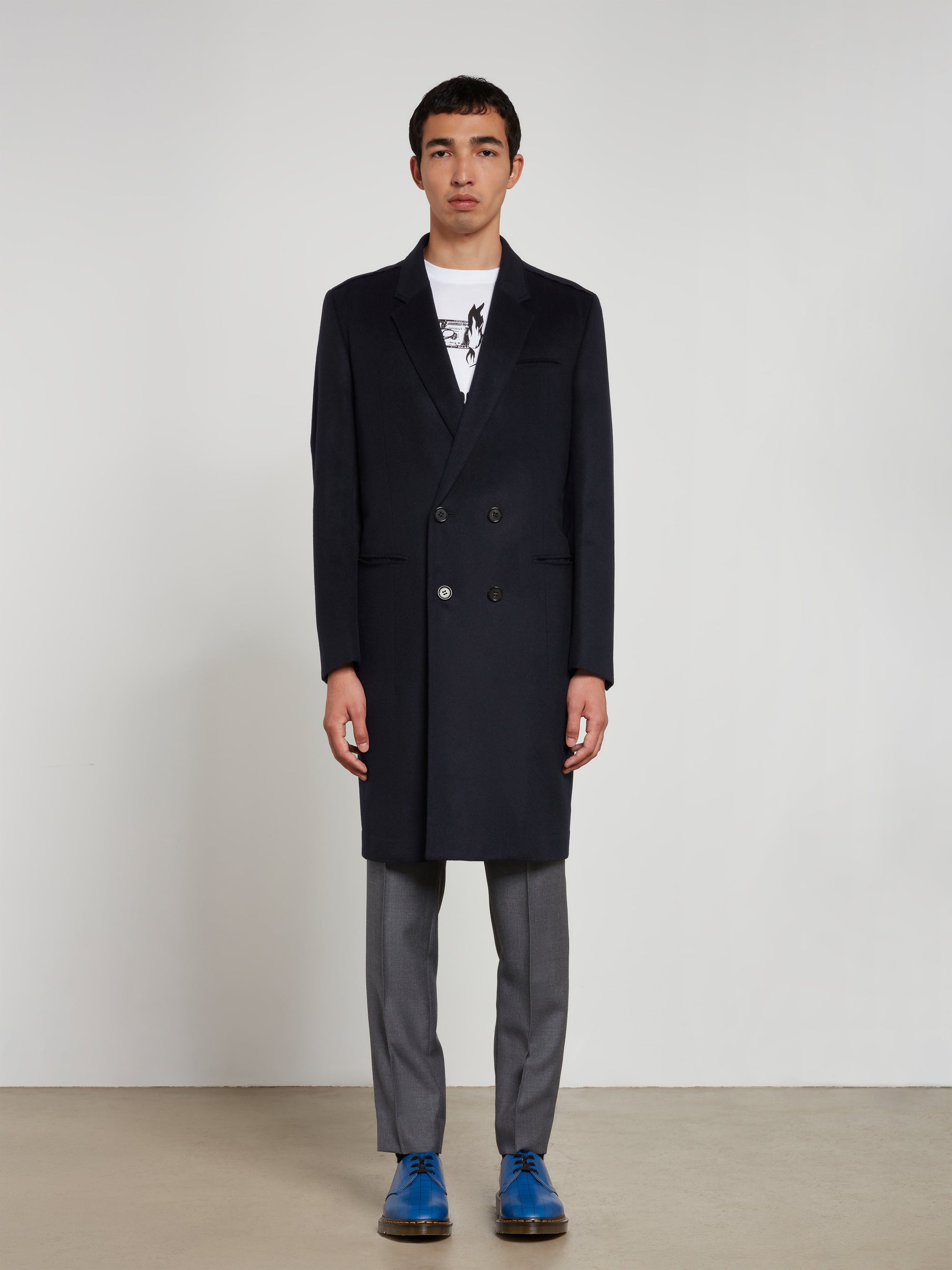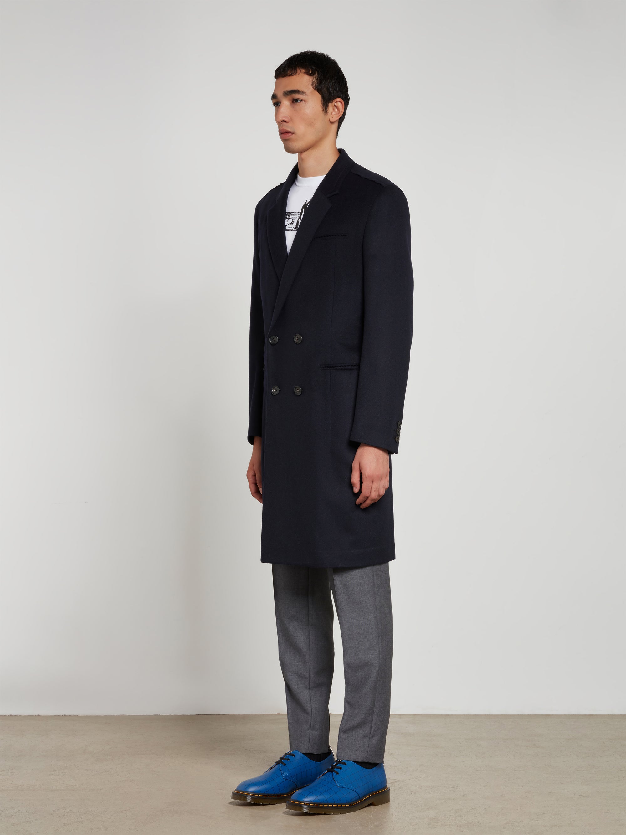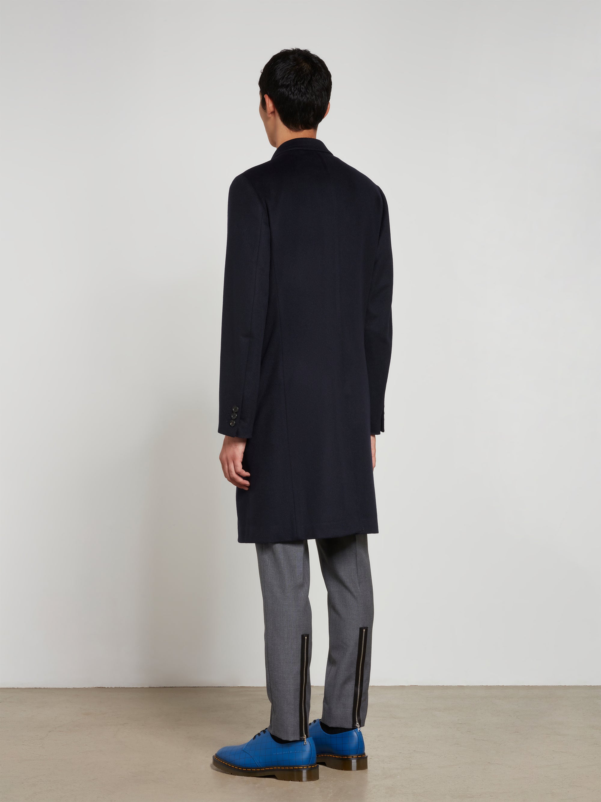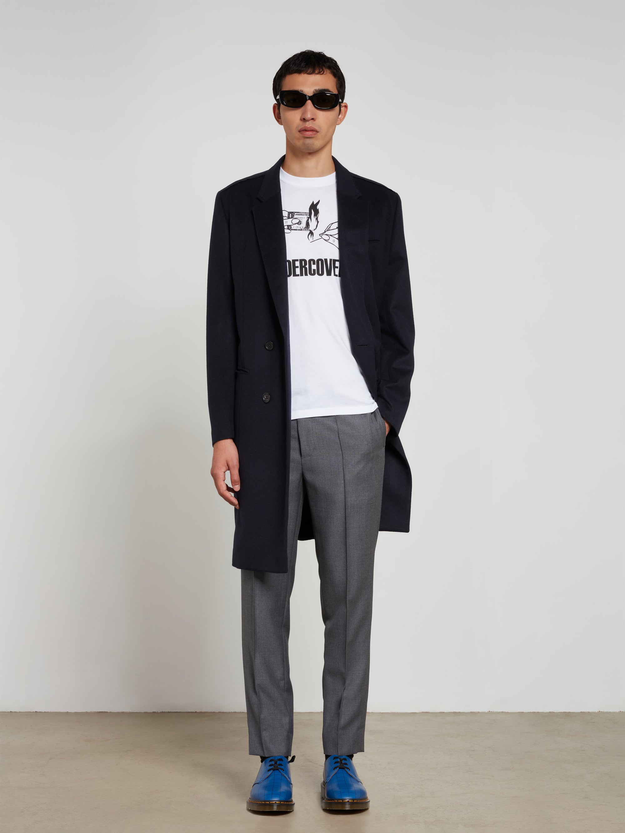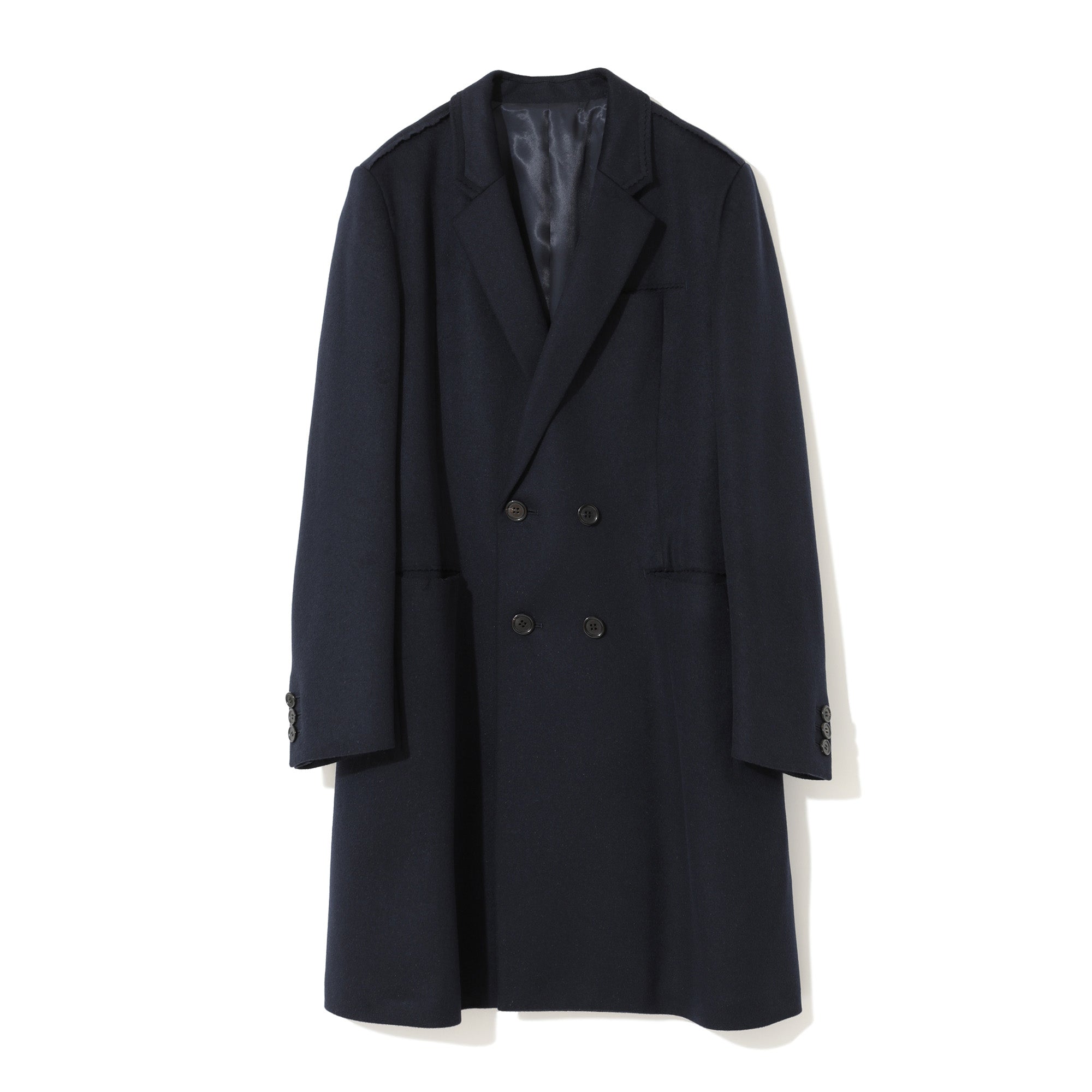 Undercover wool cashmere blend double-breasted overcoat, featuring a peak lapel and single rear vent back.