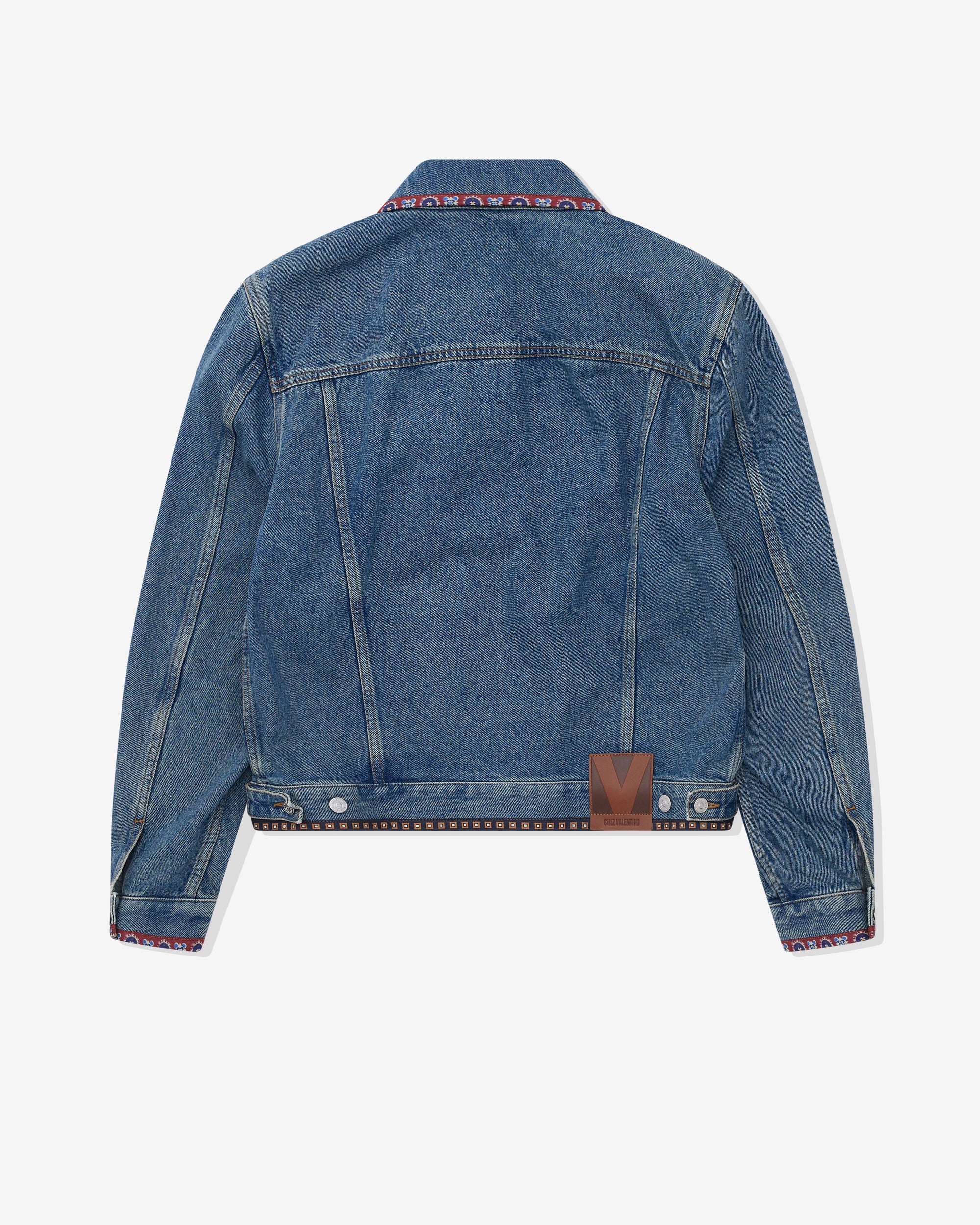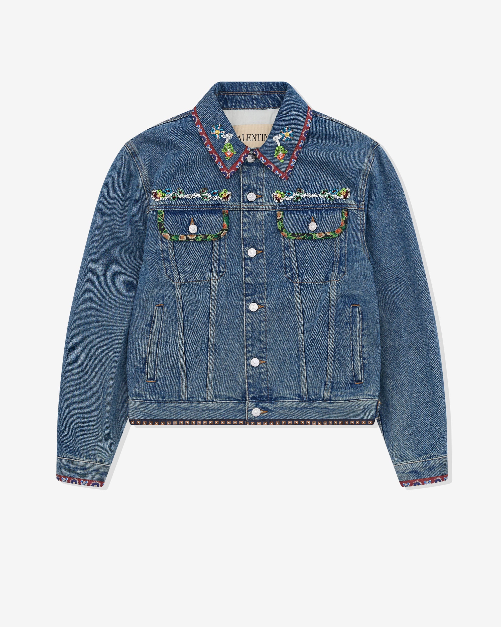 Classic jacket collarTwo front chest pocketsEmbroidered details at chest and collarFront metal button closureFront slip pocketsLeather Valentino patch at waist